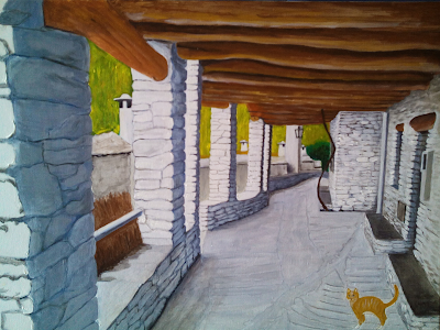 La imaginación de los artistas siempre interviene para cambiar algo en su composición dando un toque personal. Las vigas del techo aparecen en color madera, pero las originales han sido encaladas. Las piedras de la mampostería obedecen a la improvisación. El gato con el que quise adornar tanta sobriedad y que no existe, lo pinté igual que mi gata, aunque sí que vi varios la última vez que anduve por esta calle. Al final de la misma hay una fuente de la que mana agua ferruginosa, un rincón escondido alternativo a la fuente de la Ermita de Fuente Agria en Pórtugos, para quien no quiera adentrarse más en la Alpujarra sin probar este agua con gusto a gaseosa que surge de las entrañas de la tierra.